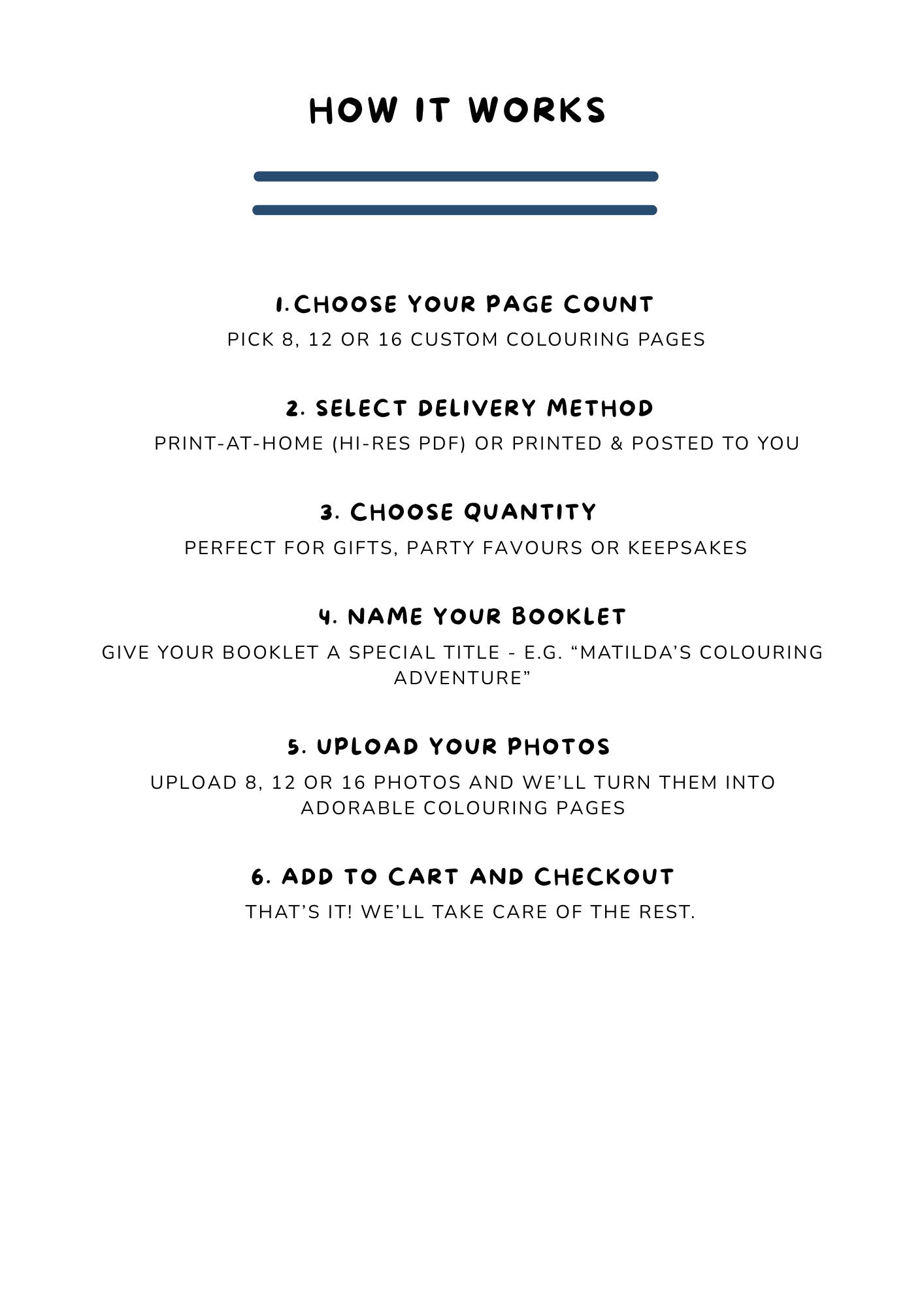 - Choose from 1, 8, 12, 16 or 20 personalised colouring pages created from your own photos